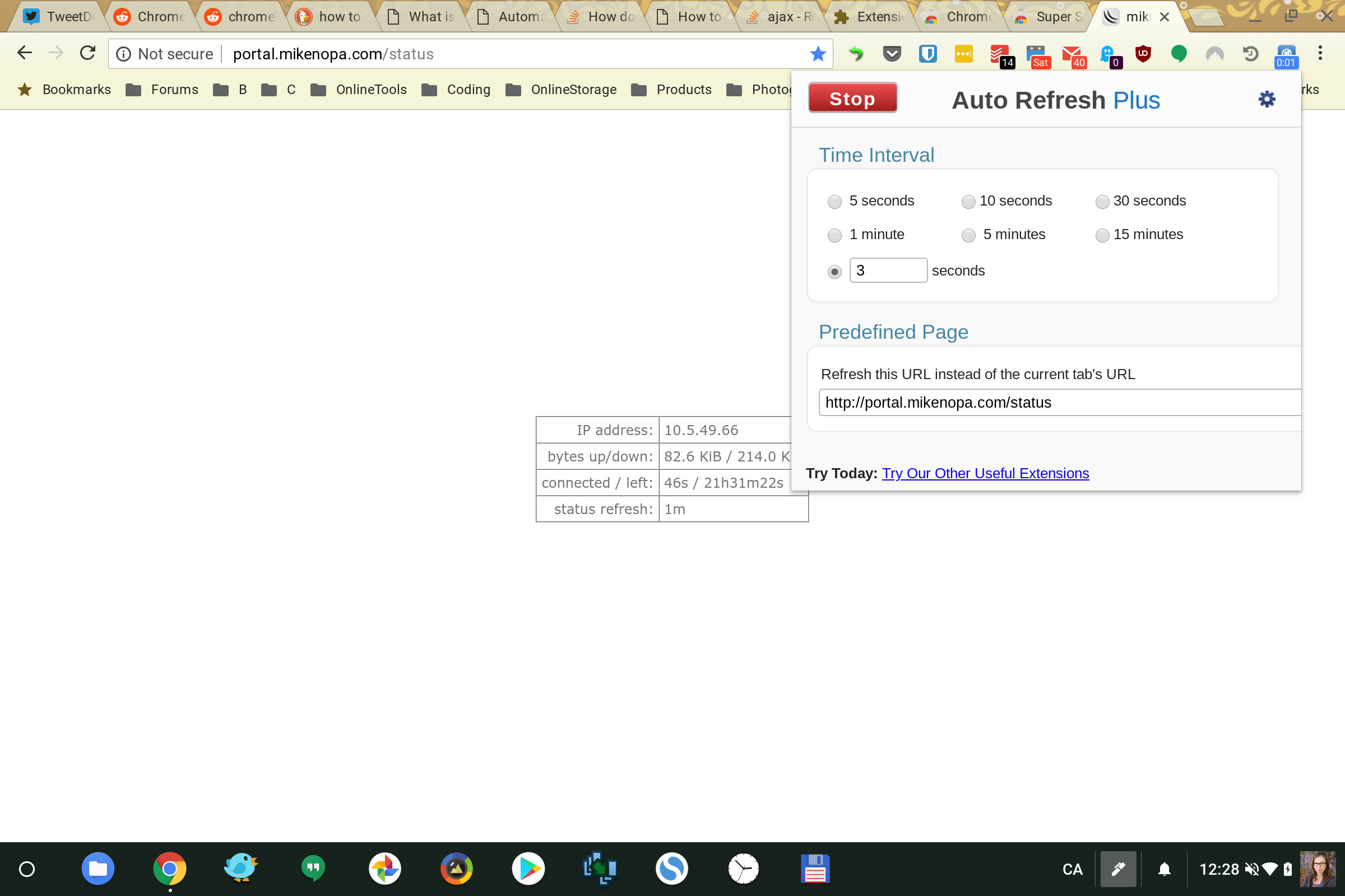 So, after trying a couple of Auto Refresh Chrome extensions, I had to choose the one that allowed me to specify which page is constantly refreshed in my tab. (And yes, every few minutes, I’m manually clearing pop up windows.) But, what I am able to do is set that extension to reload the portal status URL every three seconds (yes, three seconds), whether or not that tab has found itself redirected to Radisson’s own page. In both Sweden and Latvia, the captive portal status page URL is http://portal.mikenopa.com/status so that’s what I’ve used in the Chrome extension. It did seem like another non-secure page, like Never SSL, would work too. But, rather than cause a redirect to the portal status half the time, I decided just to use that page itself.