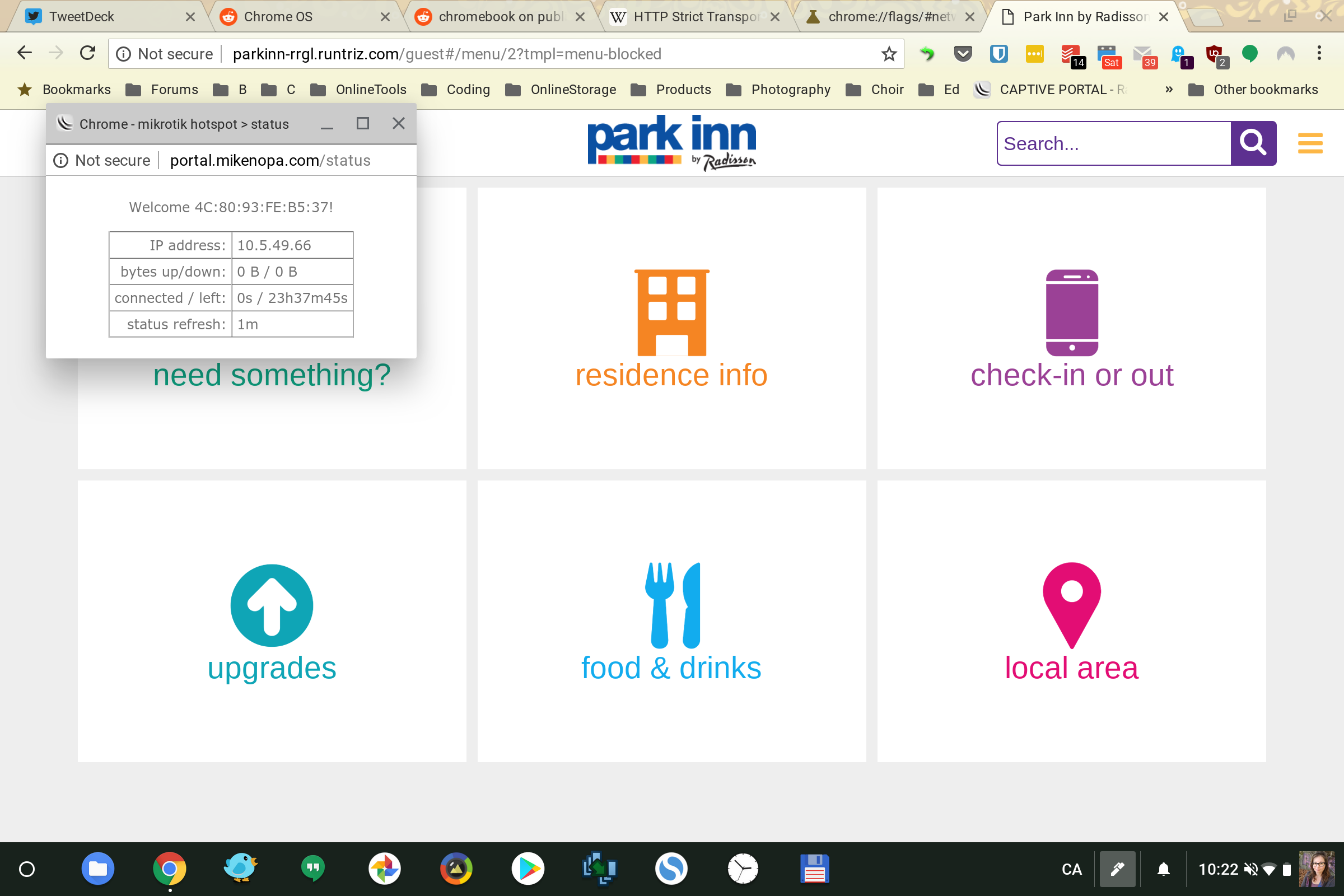 Sadly, the “I can’t connect to wifi on a Chromebook at Radisson hotels” problem is more than just finding a way to let this initial redirect happen on a Chromebook. The particular wifi portal that Radisson uses requires Chromebook users to hit a non-secure page that will redirect you to their own “portal status” page every few seconds to maintain an active internet connection. It probably also requires this of phones and other devices, but it seems that the security settings in ChromeOS do not allow this to happen transparently in the background while maintaining an active connection during all this traffic hijacking.